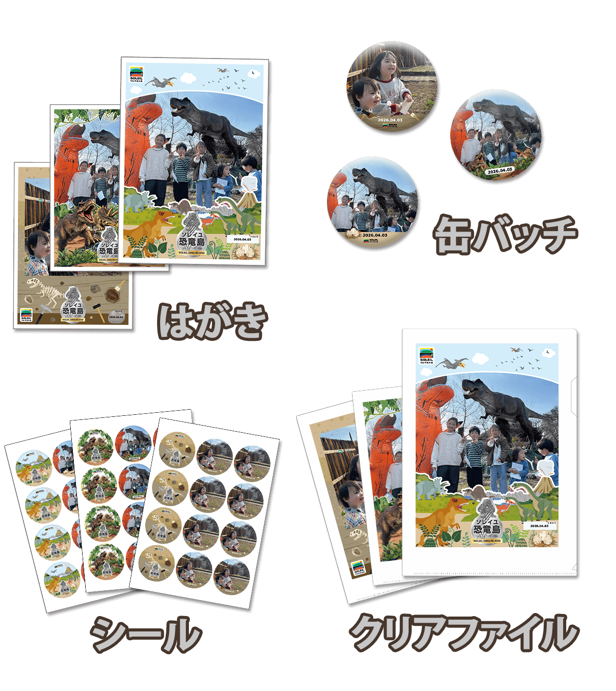 楽しんだ想い出の写真をオリジナルアイテムにして 持ち帰りませんか?缶バッチ・クリアファイル・12面シールなど
