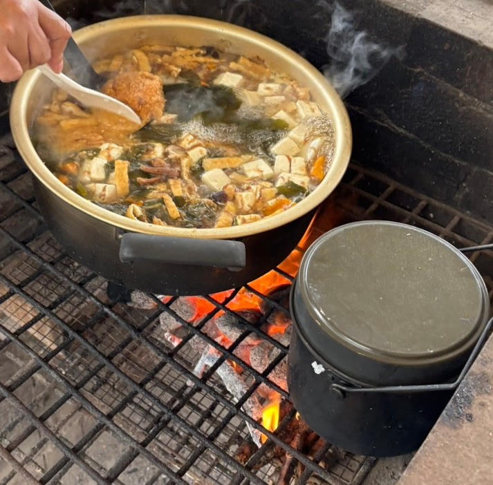 Rice is cooked in a rice cooker to make onigiri (rice balls), and local vegetables are harvested to make asazuke (pickled vegetables) and eat the chain soup.