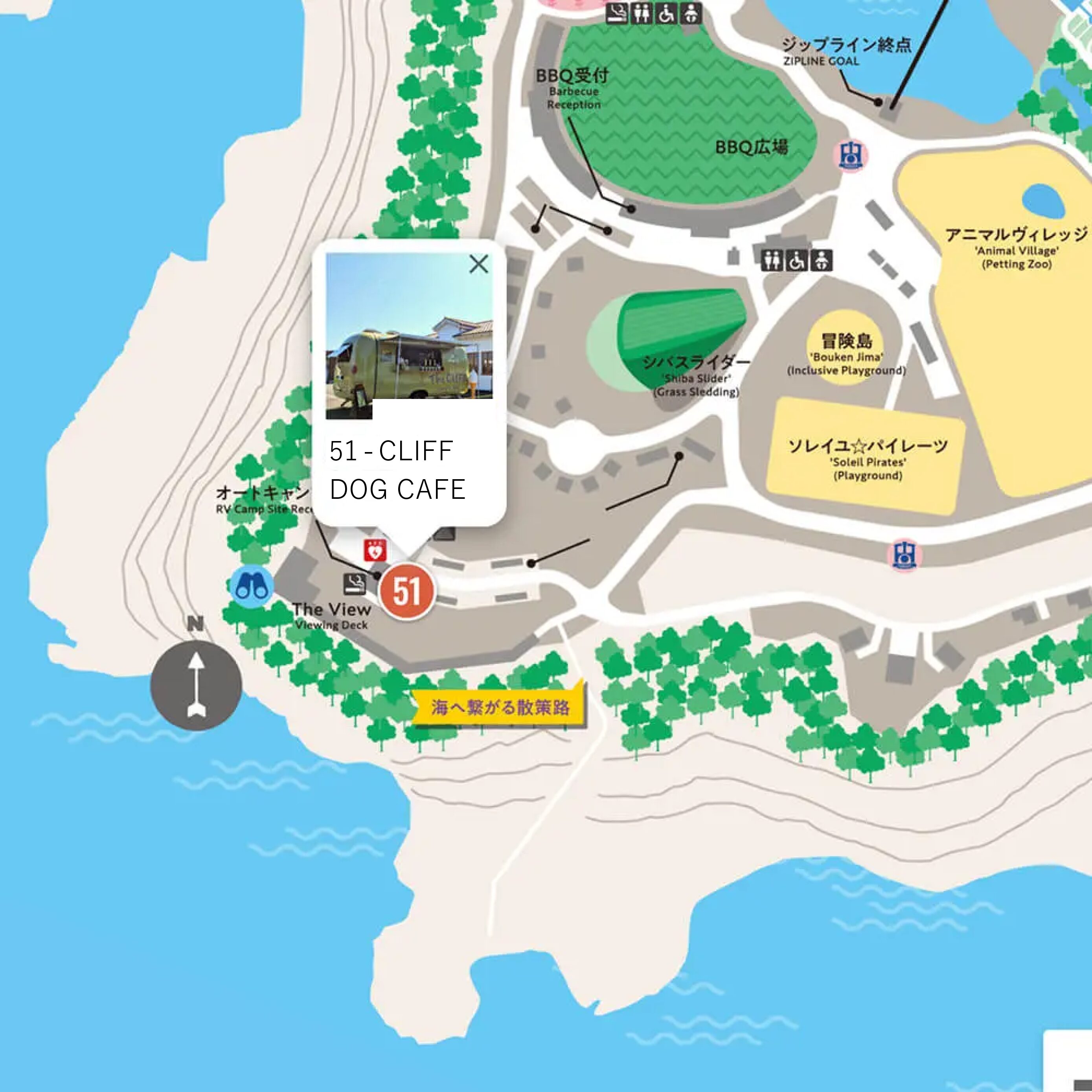 The round, colon-shaped green kitchen car stands in THE VIEW with a 180° view of the ocean! Enjoy our signature freshly ground coffee and thick soft-serve ice cream in front of the spectacular view. We also offer other menu items such as tropical juices and draft beer. Please visit our pet-friendly café where you can stop by with your pets on your way to walk along the Boardwalk!