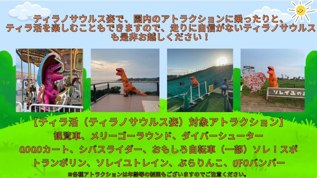 柔らかな芝生の上を、恐竜姿で全力で駆け抜ける爽快感を存分に味わう事ができ、レースの優勝者には、『オリジナルTシャツ、ソレイユの丘遊具回数券』などの豪華景品をプレゼントします。