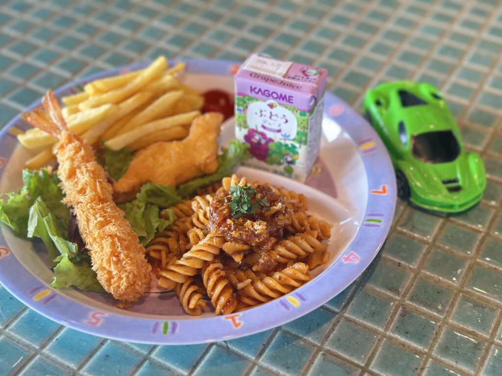 が大好きなエビフライ、チキンナゲット、ポテトフライが乗ったワンプレートメニューで