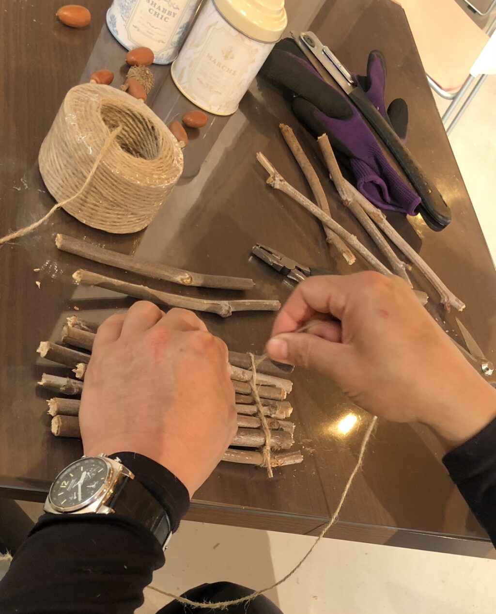 小枝でイカダのような敷物を制作して、園内で採れたドングリも隣にそえてオシャレなアレンジメントを作ってみませんか?