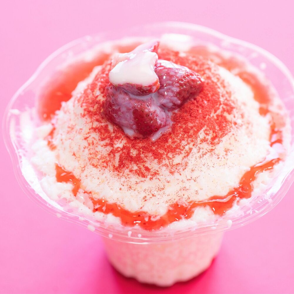 燕麥粥粥、白魚魚和薯條、雪白的韓國刨冰品特和